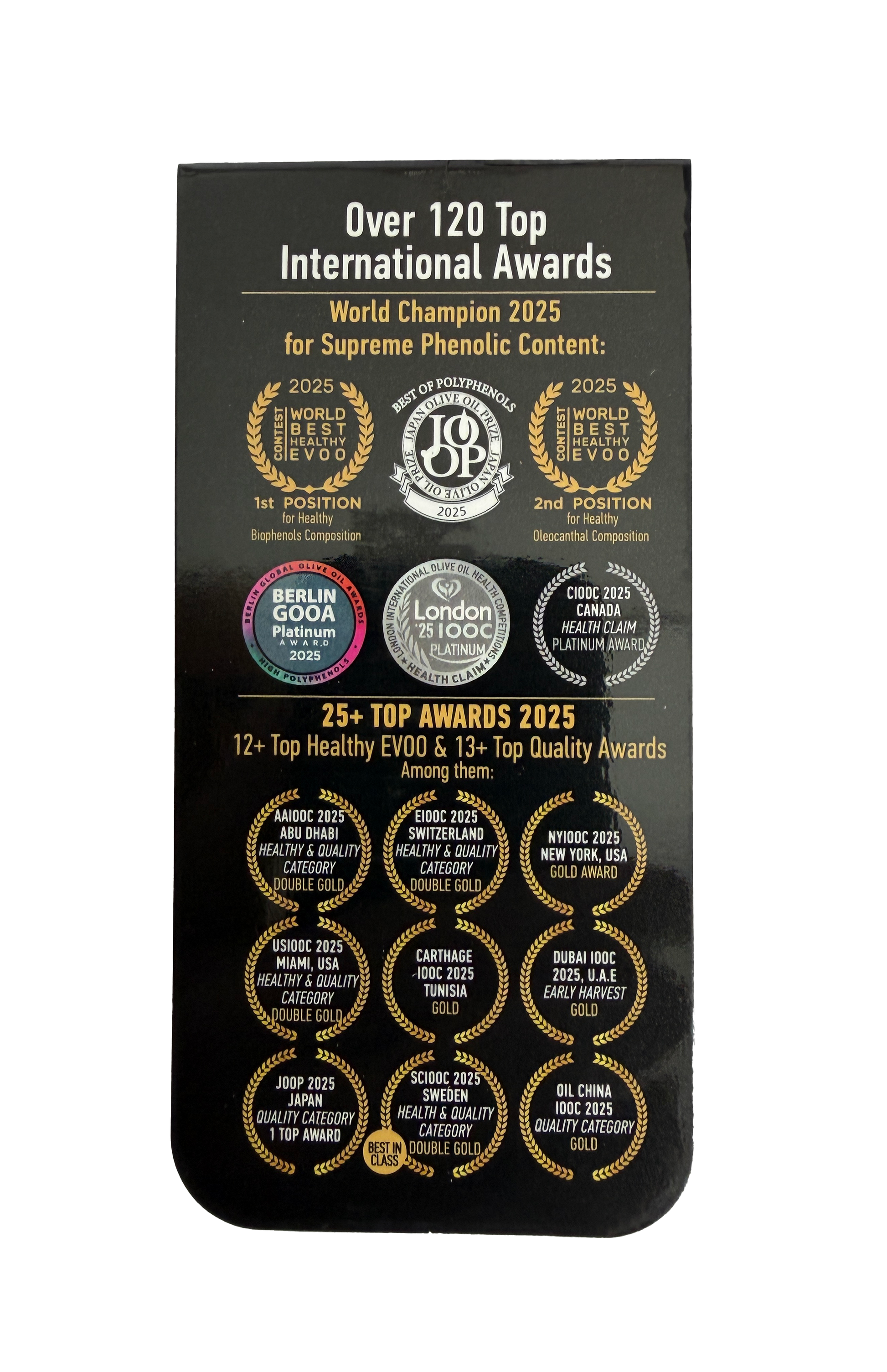 WORLD BEST HEALTHY EVOO CONTEST 13 Awards: 2019-20, 2020-21, 2021-22, 2022-23, 2023-24, 2025 (Ranked 1st)