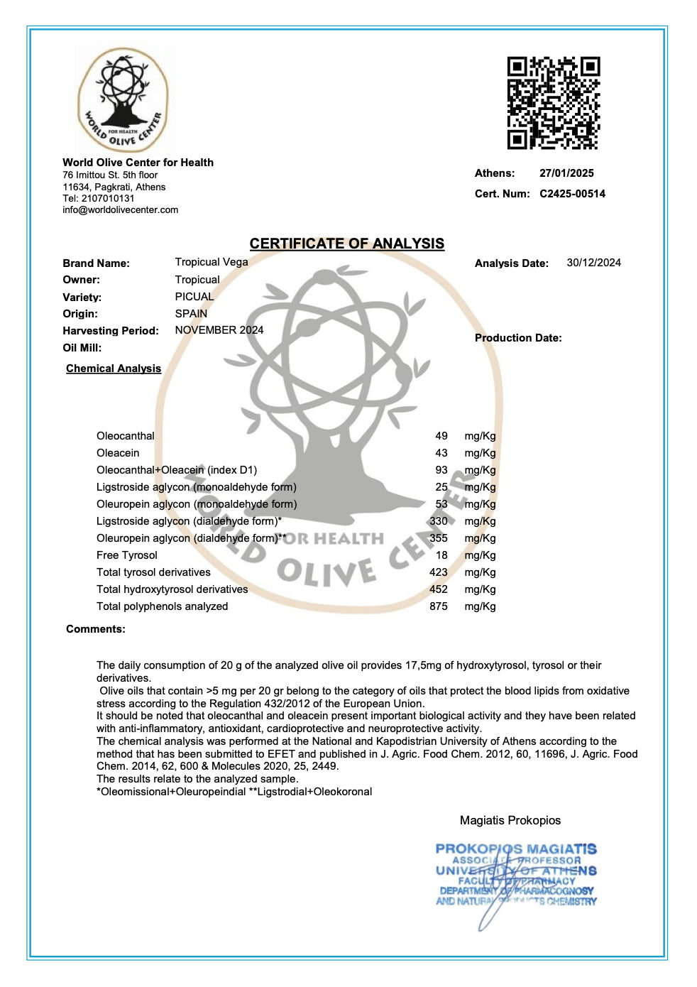 PRE-ORDER: Tropicual De Vega Organic High Phenolic extra virgin olive oil - picual